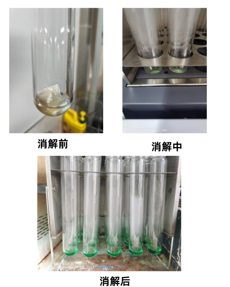2. 高溫消解:把樣品放入消化管,加入由硫酸銅 0.4g、硫酸鉀 6g、濃硫酸 10ml 組成的催化劑,置于石墨爐中歷經 230℃→350℃→420℃的三階段加熱,催化劑將有機物轉化為無機氮,溶液最終變成淡藍色液體。